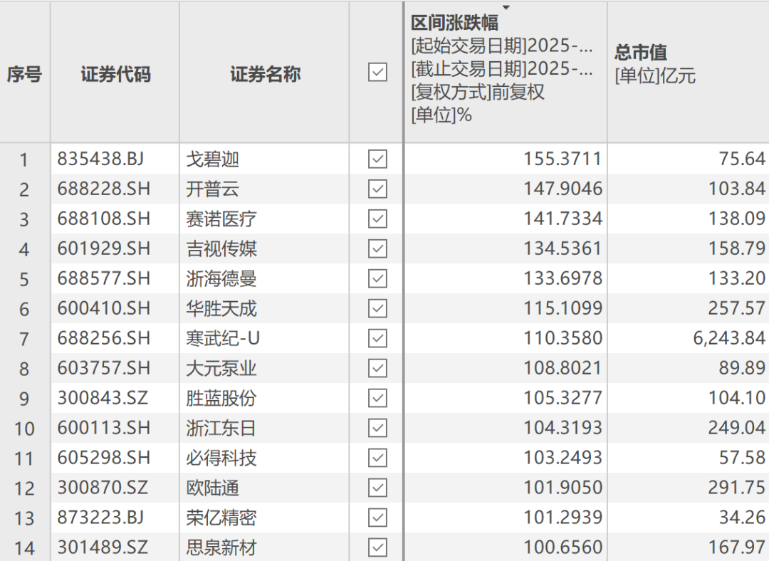 个股方面,8月有14只个股(剔除次新和ST股)股价涨超100%,其中北交所个股戈碧迦本月大涨155%,位居首位;开普云、赛诺医疗、吉视传媒、浙海德曼、华胜天成、寒武纪、大元泵业等涨幅居前。