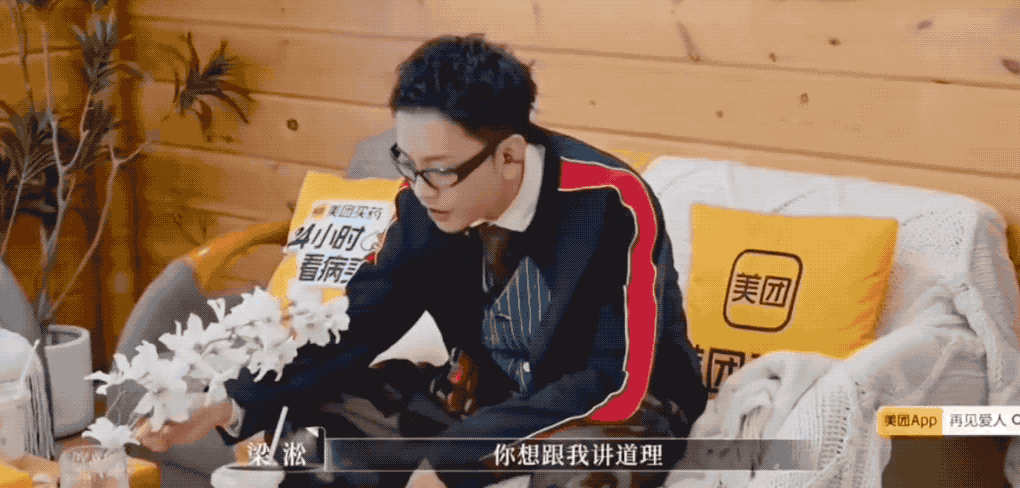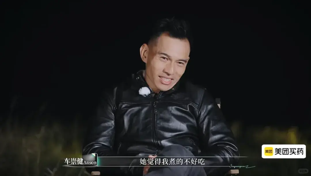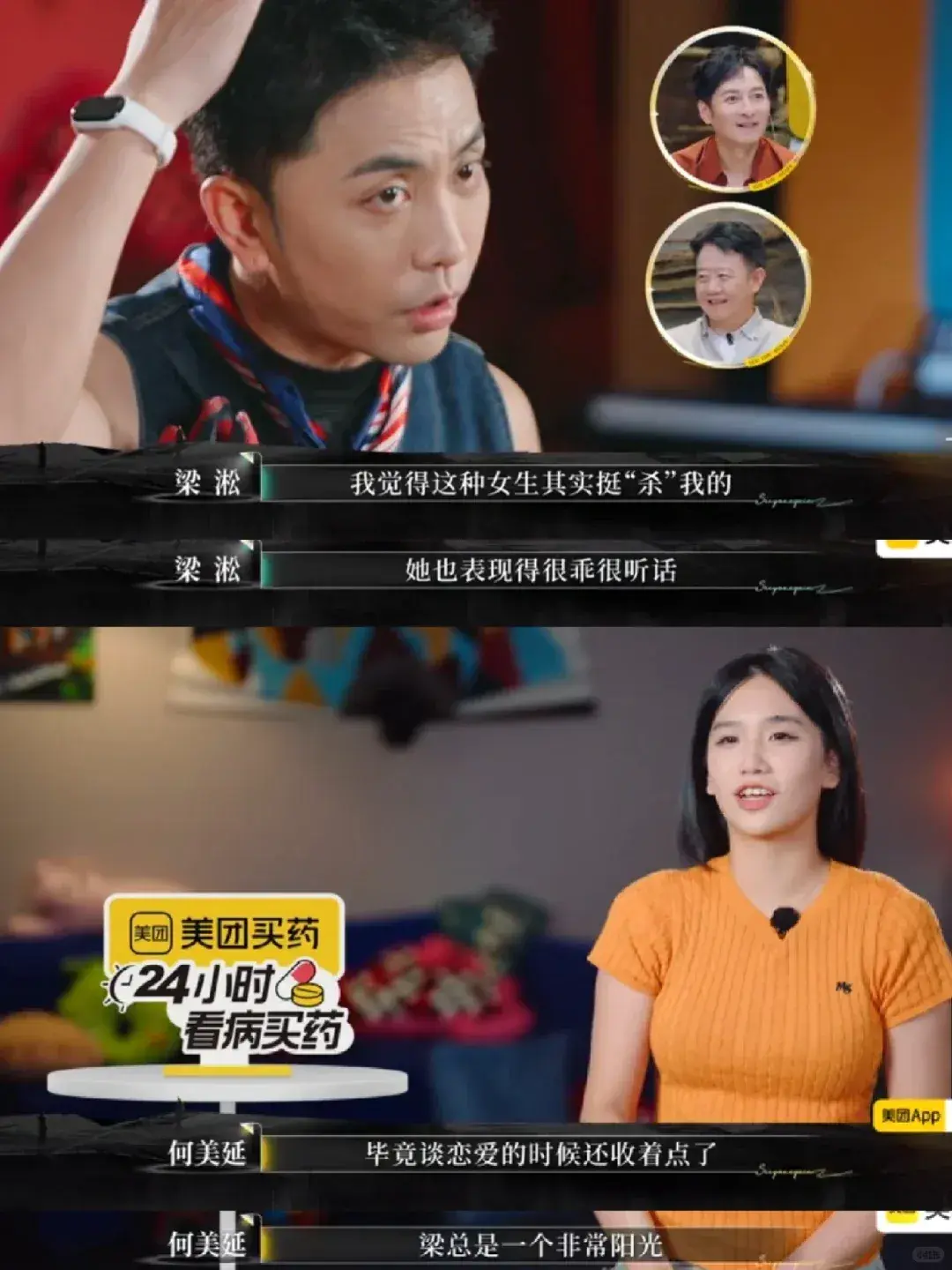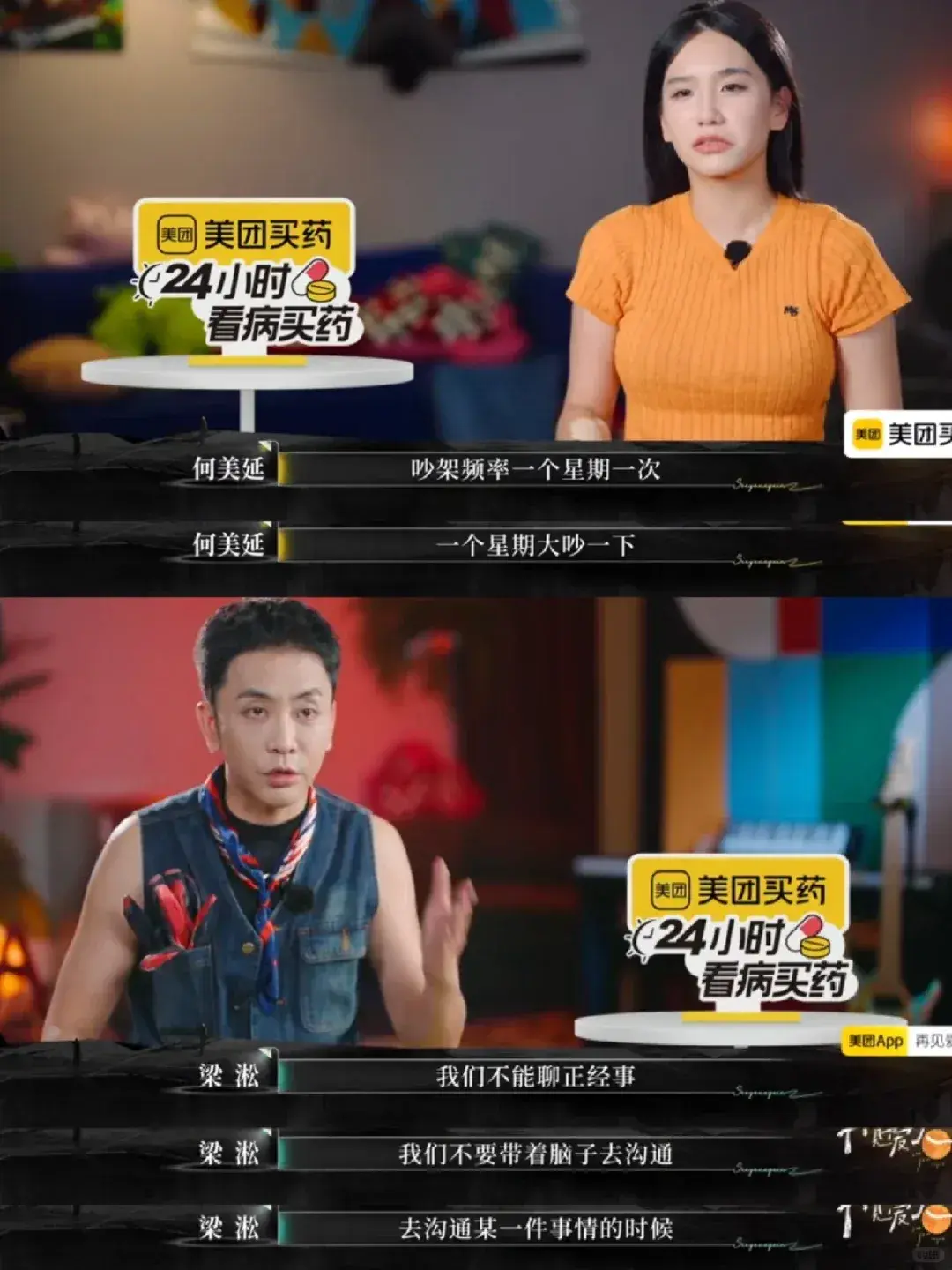 三对嘉宾第一天见面,在帐篷边对谈,提到这次事件,梁淞率先失控。