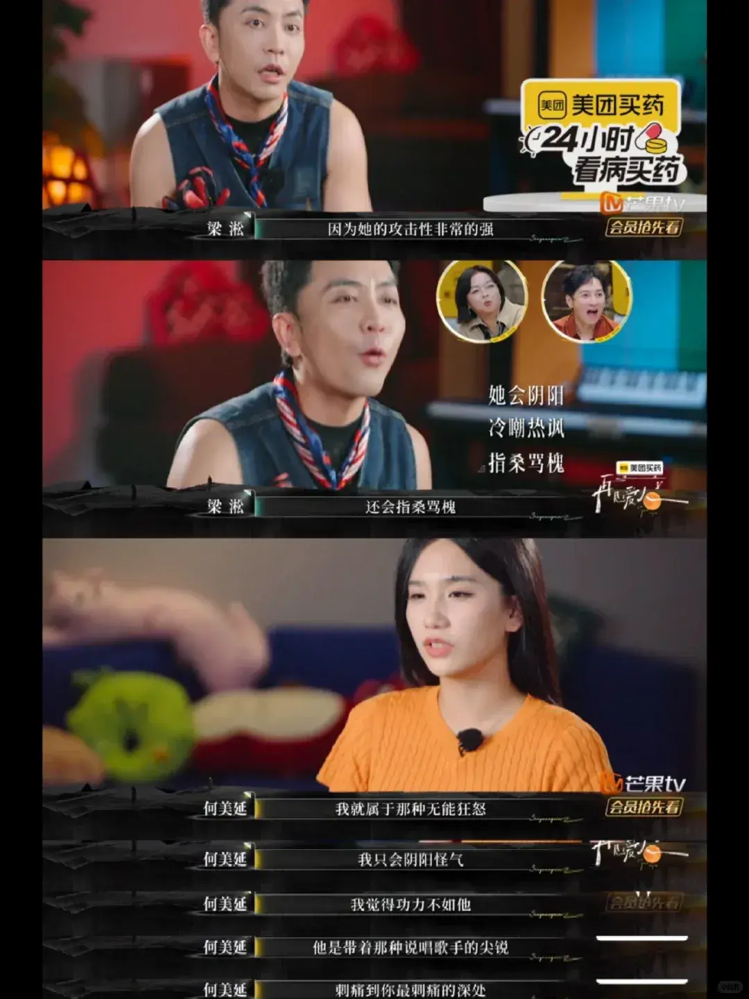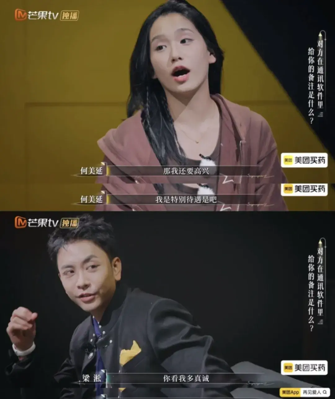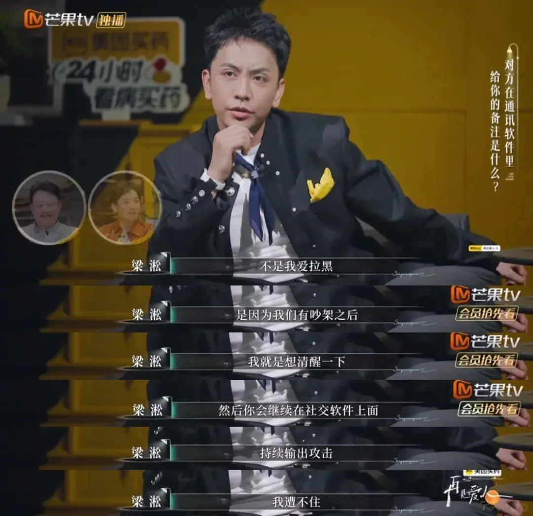 三对嘉宾第一天见面,在帐篷边对谈,提到这次事件,梁淞率先失控。